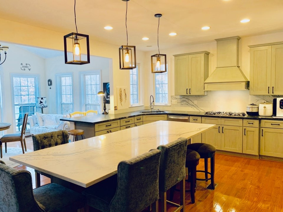 나뿐 아니라 이제는 가족의 동선까지도 고려한 아일랜드라고 하는 말 그데로 섬처럼 주방 정 가운데에 자리하고 있는 커다란 식탁이 달라진 점이다. 크기가 열 사람은 족히 앉을 수 있게 길고 큰 데다가 정중앙에 있으니 가족 누구나가 이용할 수 있다. 큰 책상이 필요한 프로젝트를 할 때도 그 큰 보드를 펼쳐놓고 이리저리 왔다 갔다 하며 완성하고, 방학이 되어 그 많은 짐 들을 다 풀어헤쳐놓고 정리하고, 한꺼번에 봐야 일이 쉬운 시골의 마트 나들이의 봉투들도 그곳에서의 펼침으로 풍성해진다. 추수감사절의 가족 모임은 아일랜드의 쓰임이 극을 다한다. 보기좋은 떡이 맛도 좋다고 음식 솜씨가 별로인 나인데도 희고 환한 테이블 위로 하얗고 큰 접시에 터키며 파이를 올려놓으면 모든 음식들이 나의 음식 솜씨를 맛보다는 눈으로 그 맛을 더욱 빛나게 해주는 고마운 식탁이 되었다.