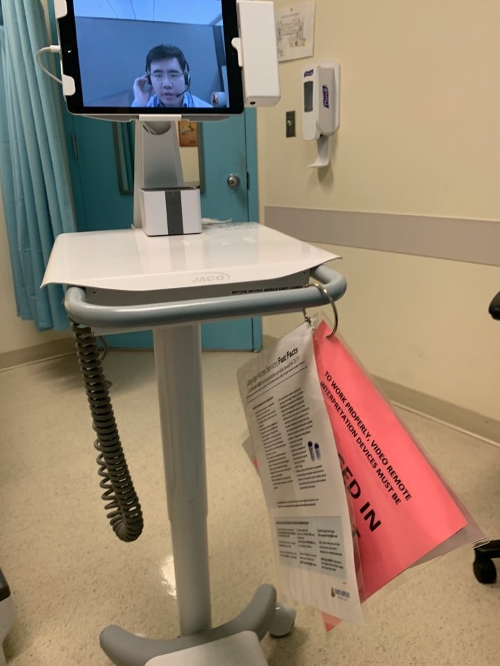 그러다 내가 평소에 마취에서 깨어나는 게 어렵다는 말에 갑자기 비상이라도 걸린 듯 여기저기 전화를 했다. 한참 후에 할아버지 한분이 닥터 명함을 목에 걸고 자신을 제1마취과 닥터라 소개하며 허둥지둥 들어왔다. 몇 마디 묻더니 정확한 대화가 필요했는지 통역을 부르겠다고 했다. 에구 언제 통역이 오나! 이리 느린 나라에서 미리 예약한 것도 아니고 지금 부르면 언제 오고 언제 집에 가나! 나야 시간이 있지만 두 의사는 시간이 많지 않을 거 같은데라며 걱정하고 있는데 어머나! 이동식 화면에서 한국말이 갑자기 들렸다. "안녕하세요? 존스 홉킨스 동시 통역사 ㅇㅇ입니다. 무엇을 도와드릴까요?" 중대한 사안이 된듯했다.