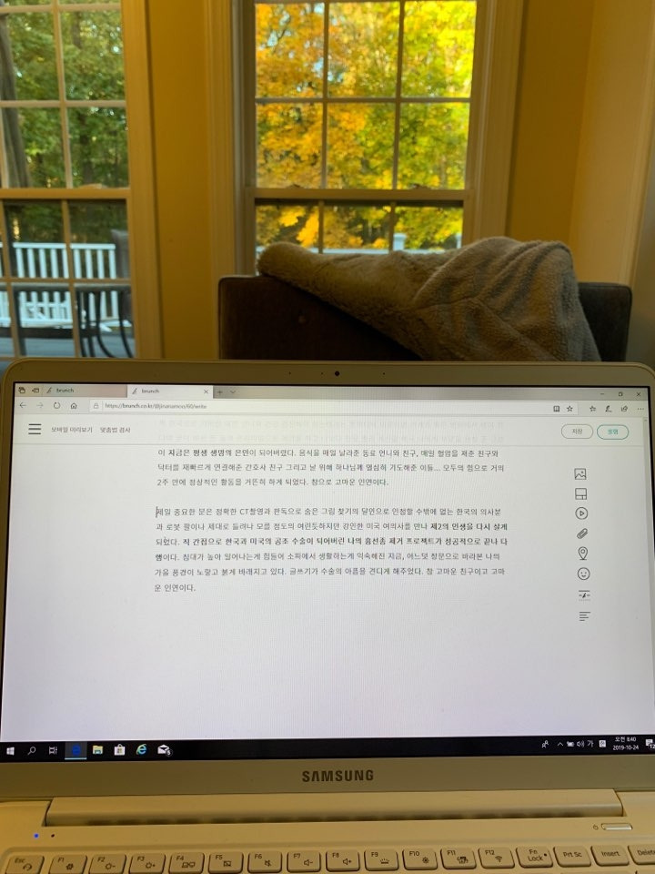 제일 중요한 분은 정확한 CT촬영과 판독으로 숨은 그림 찾기의 달인으로 인정할 수밖에 없는 한국의 의사분과 로봇 팔이나 제대로 들려나 모를 정도의 여린듯 보이지만 강인한 미국 여의사를 만나 제2의 인생을 다시 살게 되었다. 직 간접으로 한국과 미국의 공조 수술이 되어버린 나의 흉선종 제거 프로젝트가 성공적으로 끝나 다행이다. 침대가 높아 일어나는 게 힘들어 소파에서 생활하는 게 익숙해진 지금, 어느덧 창문으로 바라본 나의 가을 풍경이 노랗고 붉게 바래지고 있다. 글쓰기가 수술의 아픔을 견디게 해 주었다. 참 고마운 친구이고 고마운 인연이다.