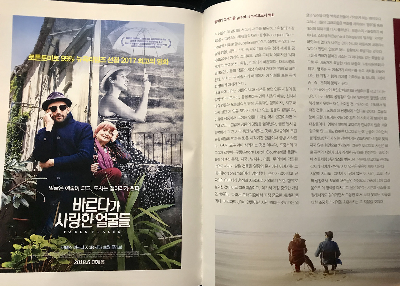 바르다와 JR이 만들어낸 사진 벽화는 잊혀가는 얼굴과 일상을 대형 벽화로 만들어 기억하게 하는 ‘행위’이다. 그들의 그래피즘은 벽화를 제작하는 '행위'를 통해 대상의 이야기를 다시 불러낸다. 베르나르 스티글러(Bernard Stiegler)의 말처럼 ‘기억은 머릿속에 없다가 나오는 것이 아니라 머릿속에 내재되어 있다가 원인이 있으면 어느 상황에서 촉발되는 것’이다. 그렇게 벽화가 붙여진 장소는 그 어디에도 없는 특별한 곳으로 두 예술가가 촉발한 대리 보충의 그래피즘(벽화)가 되고, 영화는 두 예술가가 이야기를 듣고 벽화를 만들어 내는 전 과정과 행위 자체를 기록하는 또 하나의 그래피즘(다큐)이 된다.