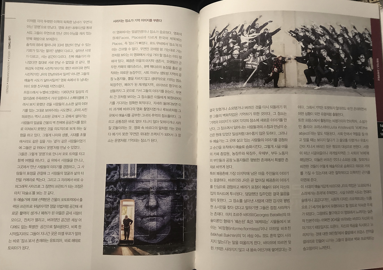 이 시대의 예술가답게 바르다와 JR의 작업은 ‘소외되거나 스러져가는 존재’에 주목한다. 사실 이러한 시도는 현대미술에서나 공공디자인, 사회적 디자인 프로젝트라는 라는 이름으로 최근 유행이라고 할 정도로 익숙한 주제다. 그럼에도 불구하고 이 영화에서 느껴지는 실존적 인본주의는 어쩌면 90세를 바라보는 바르다 자신의 이야기이기 때문일지도 모른다. 죽음을 직시하고 ‘스러져가는 것에 대한 애잔함’에서 출발해서 프랑스 전역을 갤러리로 만드는 그들의 콜라보 벽화 프로젝트는 숭고함까지 느껴진다.