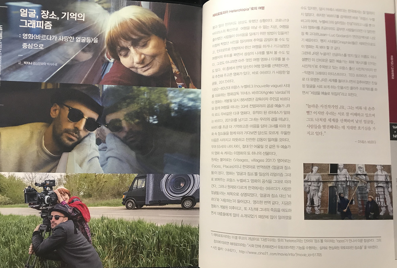 한국어 영화 제목인 <바르다가 사랑한 얼굴들>이라는 제목에서 장소는 드러나지 않지만 영화의 원제인 얼굴과 장소(Faces, Places)인 것처럼 이영화에서는 얼굴만큼이나 장소가 중요하다. 일종의 로드 무비인 이 영화에서 ‘장소’의 의미는 간과할 수 없다. 우연처럼 맘 가는 대로 가는 것처럼 보이는 이 영화에서 사실 가야 할 장소는 이미 정해져 있다. 폐광촌 마을의 마지막 생존자, 오랫동안 근무한 카페의 웨이트리스, 8백 헥타르의 농장을 홀로 경작하는 외로운 농장주인, 샤토 아르누 생토방 지역의 공장 노동자들, 뿔을 자르지 않고 생태적으로 키우는 염소 목장주인, 폐허가 된 재개발지역, 르아브르 항구의 여성들의 이야기를 듣는다.