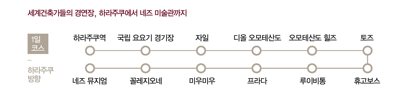 만약 도쿄에 왔는데 딱 하루 정도 건축을 보고자 한다면, 하라주쿠에서 오모테산도까지의 현대건축들을 보는 것을 추천한다. 이 거리는 세계적 건축가들의 서로 경연을 하는 것처럼 세계적인 건축가들의 건축을 한자리에서 만날 수 있고, 특히 야경이 아름다워서 일정을 다 마치고 저녁에 둘러보기에도 참 좋은 곳이기 때문이다.