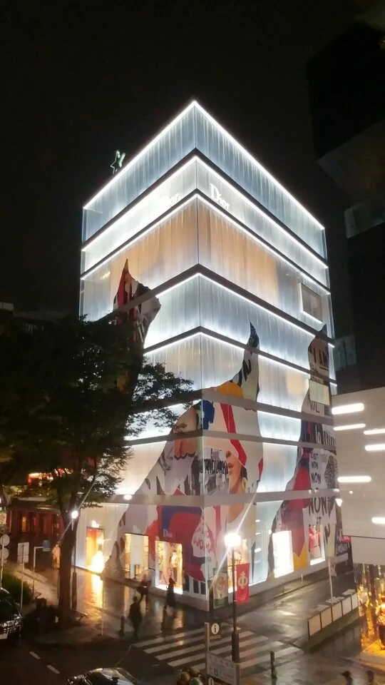 그 옆에 하얀색으로 빛나는 맑고 투명해 보이는 건물은 일본 건축가 듀오인 SANAA가 디자인한 ‘디올 오모테산도’다. SANAA는 세지마 카즈요와 니시자와 류에가 공동으로 작업하기 위해 지은 이름이라고 한다. 이 건축은 건물 외벽을 이루는 유리의 안쪽에 아크릴로 만들어진 하얀 커튼이 물결이 치는 듯 두르고 있어서 우아한 모습이 특징이다. 밤에 조명이 켜지면 더 아름답다.