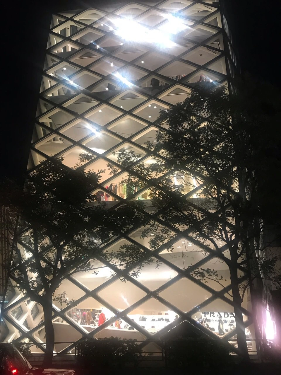 더 내려가면 여행가방이 쌓인 모양인 준 아오키의 ‘루이뷔통 매장’과 베이징 올림픽 때 새둥지 모양의 스타디움, 즉 베이징 올림픽 주경기장을 건축해 일약 스타덤에 오른 건축가 듀오인 스위스의 헤르초크 & 드 뫼롱 건축사무소(Herzog & de Meuron Architekten)가 설계한 2002년 오픈한 ‘프라다 아오야마점’이 보인다.
