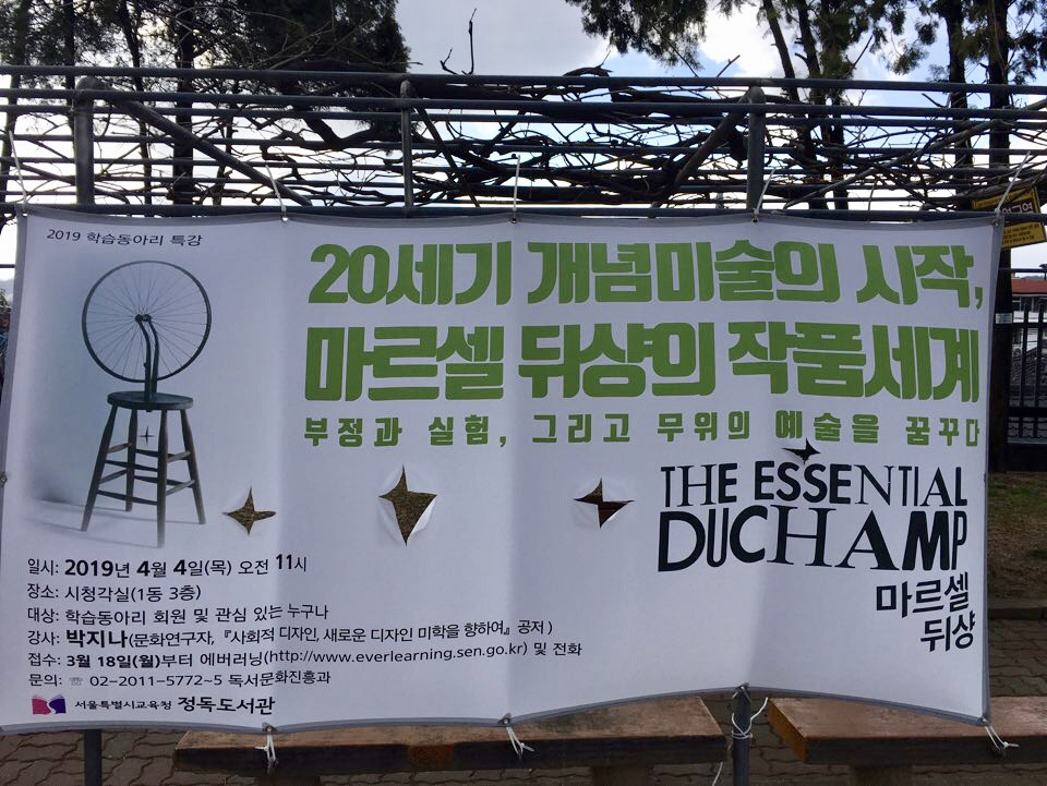 지난해 정독도서관에서 강의한 나의 뒤샹 특강의 경우는 특히 반응이 좋았다. 뒤샹은 개념아트의 시작으로 그의 개념은 난해하기도 하지만 그의 작품들 자체가 미학적으로도 퍽 매력적인 것은 아니기 때문에 미술관에서 뒤샹을 본다는 건 뭔가 또 다른 도움이 필요한 것이었다. 또는 뒤샹의 샘은 알지만 '개념미술'이니 '뉴욕 다다'니 하는 사조나 그의 미술 용어들은 익숙하면서도 생경한 느낌을 주기 때문에 이를 역사적 맥락과 문화적 맥락 그리고 미술사적 맥락에서 설명해 드렸더니 너무들 좋아하셨다.