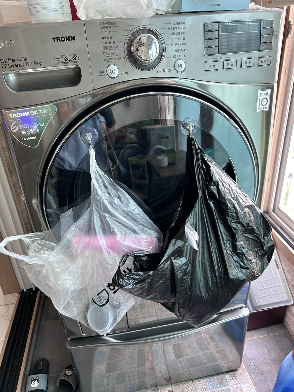 어디서 어떻게 시작해야 좋을지 막막하다. 일단 쓰레기부터 정리하기로 한다. 재활용할 것과 쓰레기를 모은다. 봉지 2개를 가져와 쓰레기를 정리한다. 정리의 시작은 쓰레기를 비우는 거다. (그만큼 쓰레기 정리도 안되어 있다) 봉지에 넣다가 '번뜩이는 아이디어'가 떠오른다. 세탁기 문짝에 고리를 붙이고 정리를 한다. 한결 수월하다. 큰 봉지에 한가득 쌓이면 봉지 바꿔 주고 반복한다.