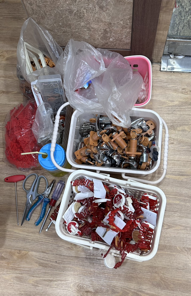 하지만 이런 상쾌한 수리는 전체의 10% 남짓. 나머지는 아주 정성 들여 '수작업'해야 한다. 부러진 열쇠는 빼고. 새 열쇠로 교체하고. 여탕 전용 빨간 열쇠 팔찌에 숫자 맞춰 끼운다. 롱로우즈로 딱 맞게 껴야 하는데 이게 또 손끝 감각 싸움이다. 한 손엔 숫자 열쇠. 다른 손엔 빨간 고무 팔찌. 입엔 욕이 들어갔다 나온다.