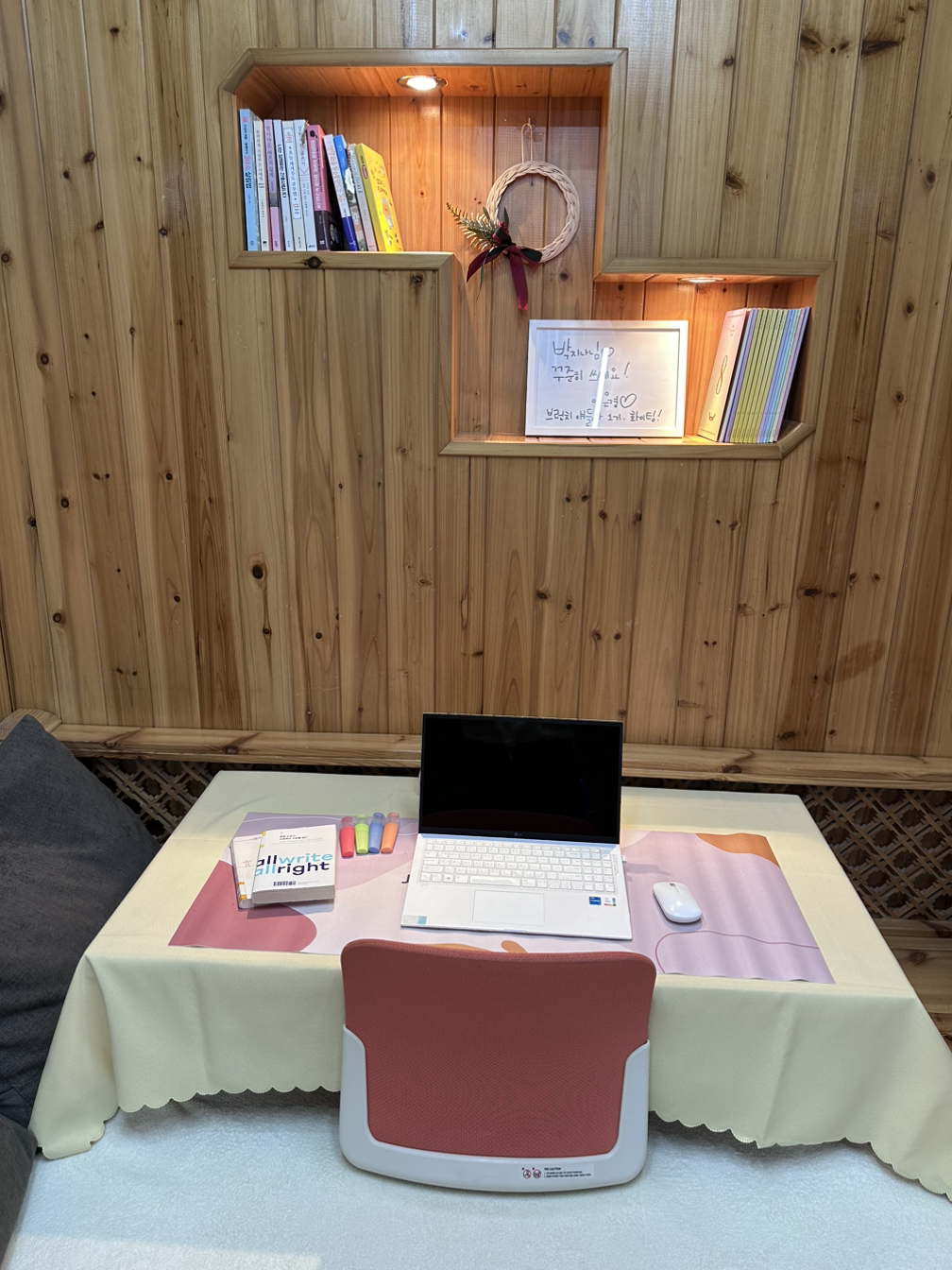 차가운 마룻바닥에 따뜻한 카펫을 깔고 깔끔하게 테이블보를 깔고 나니, 더 아늑한 공간이 되었다. 직접 만든 라탄공예로 한껏 멋을 부리고 이은경선생님의 사인을 액자에 걸어 꾸며 놓았다. 이제, 이 공간에 들어오는 것만으로도 행복할 것 같은 기분이 든다.