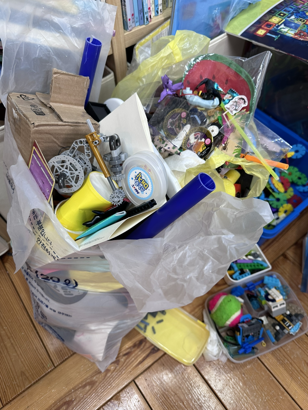 정리는 아주 오래 걸린다. 쓰레기 봉지를 무작정 들고 온다. 일단 필요 없는 걸 버리기 시작한다. 버리면서 무질서하게 섞여있는 자질구레한 장난감들을 분류한다. 그렇게 쓰레기봉투 한가득 2 봉지가 나오고 재활용으로 버릴 것도 많이 나온다. 이제 잘 가지고 놀지 않는 자석장난감 등은 당근에 올리려고 옆으로 빼놓는다. 처리 곤란 인형들은 함께 모아놓는다. 옛날에는 장난감 버리면 난리 났던 아이들도 적극적으로 얘기한다. "이건 비울 거야. 이건 아기 줘야겠다." 하고. 그렇게 무한반복 정리하며 지칠 때쯤엔 하나만 생각한다.