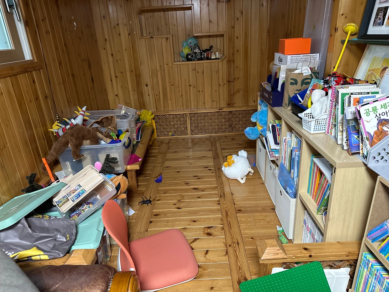 결혼한 지 10년 차인데, 우리 집에 나만을 위한 공간이 없다는 게 속상했다. 그래서 '매의 눈'으로 집을 살펴보기 시작했다. 책상을 사기엔 가격이 사악하고 있는 가구를 활용하고 싶었다. 어디를 할까 고민하다 놀이방으로 쓰이던 공간이 눈에 들어왔다. 여기는 전에 살던 집주인이 인테리어를 하여 만들어 놓은 특별한 공간이다. 인테리어를 나무로 해서 눈에 띄는데, 현재는 아이들 놀이방으로 쓰고 있다. 그런데 관리가 안되니 잡동사니 공간이 되었고 각종 장난감들이 쌓여 '죽어있는 공간'이 되었다.