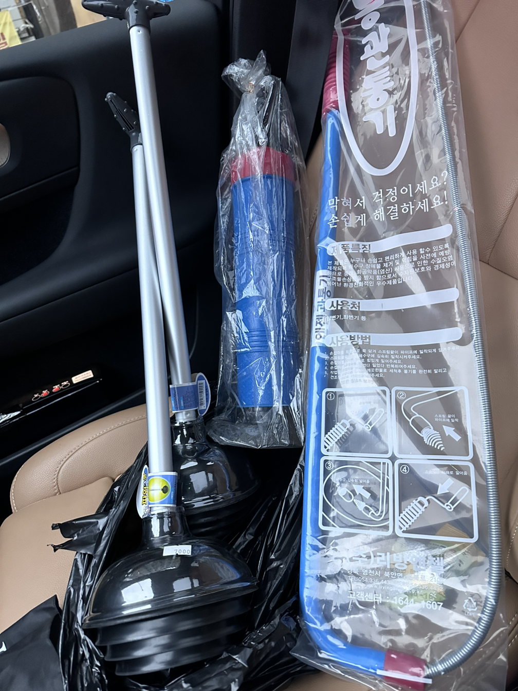 강의했던 옷을 입고 변기 뚫을 수 없으니, 집에 들러 운동복으로 갈아입었다. 착용하고 있던 귀걸이, 목걸이, 시계도 다 뺐다. 머리는 집게핀으로 집어 올렸다. 화장만은 귀찮아서 그대로 두었다. 혹시 뚫어뻥이 오래되어서 안되는가 싶어 철물점에 들러 '뚫어뻥 풀세트'를 사들고 현장에 투입. 장비탓 하면 안 되지만 특별한 기술이 있는 것도 아니니, 이것밖에 믿을 게 없었다. 여탕 변기 네 개 중 세 개가 막혀 있으니 상황이 긴박했다.