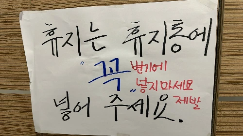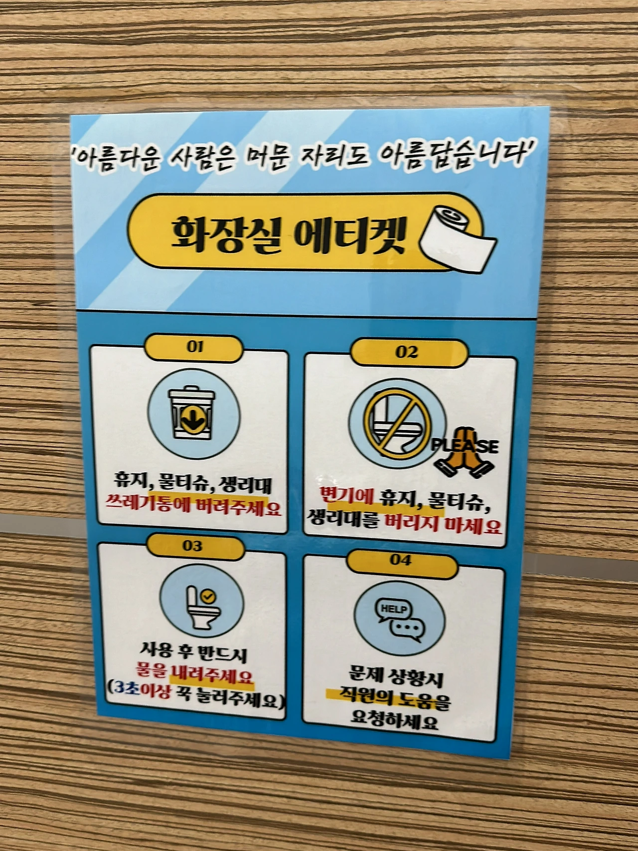 마음속은 한없이 애잔한데 현실은 변기를 격렬하게 뚫고 있는 상황. 묘하게 아이러니한 상황 속에 어쨌든 남편과 합심해서 3개의 변기 모두 뚫긴 했다. 그런데 찝찝했다. 시원하게 쭈우욱 내려가는 느낌은 없었다. 누가 휴지 한 장만 과하게 넣으면 바로 막힐 것 같은 예감. 예전에 내가 디자인해서 예쁘게 만들어 붙여둔 '화장실 에티켓' 안내문은 쓸모가 없었다. 디자인이고 뭐고 필요 없다. 급하게 종이에 써 붙였다.