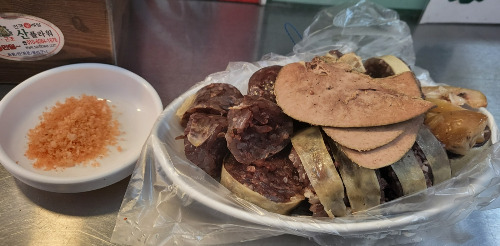 맨 처음으로 나온 음식은 순대. 한입에 먹기 어려운 정도의 대왕 사이즈에 놀란다. 소금에 살짝 찍어서 한입 와아앙 베어 먹으니 부드럽고 찰지다. 맛있는데 크기까지 하니 입 안 가득 흐뭇하다. (지금껏 내가 먹은 순대는 순대가 아니었던가. 맛있는 순대의 기대치가 확 올라간 느낌이다. )