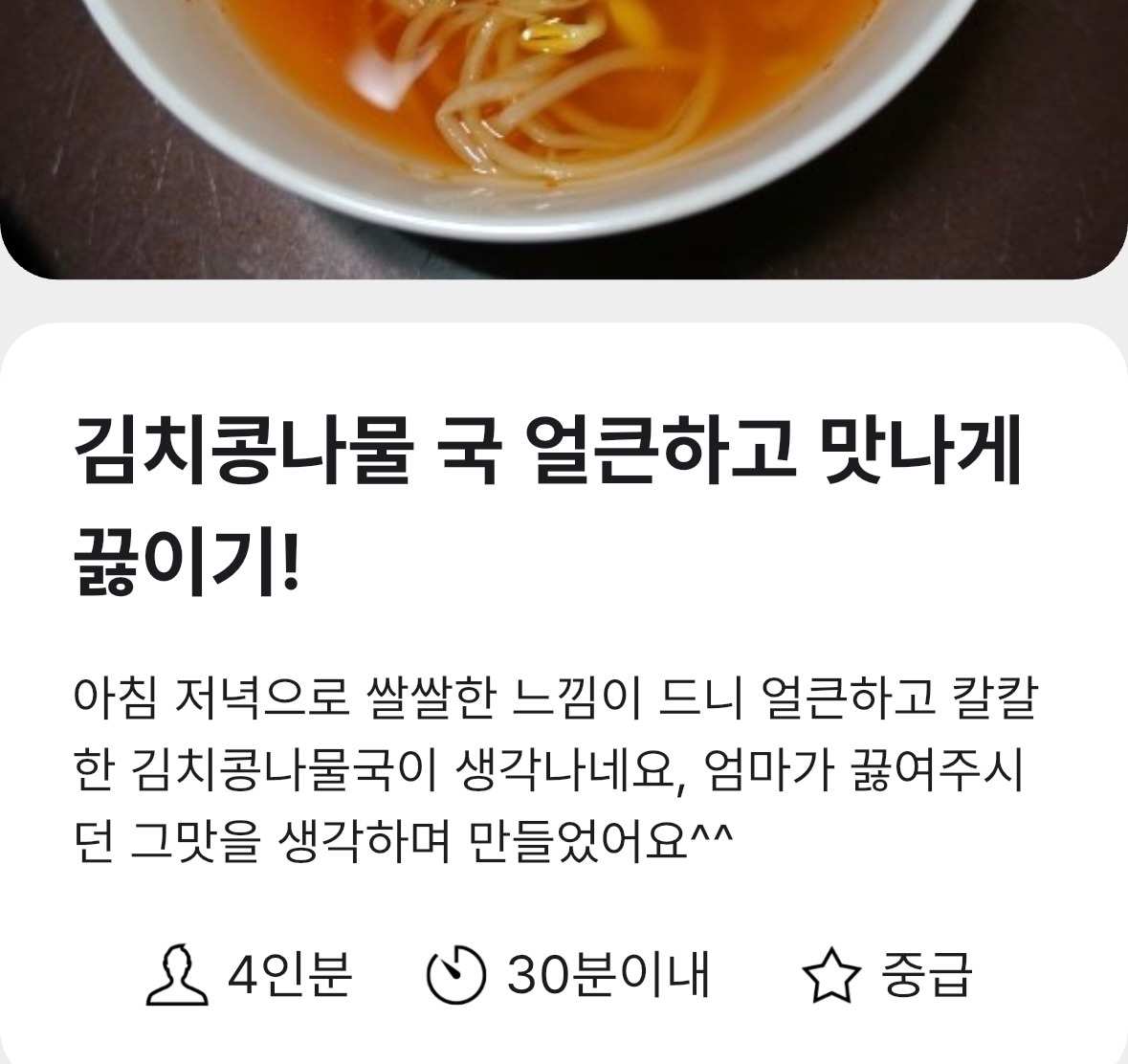 육수로 국물을 내고 김치 넣고 고춧가루와 다진 마늘을 넣고 콩나물 넣고 간장이나 소금으로 간을 맞추고. 말로는 이 쉬운 요리도 요린이 엄마는 레시피를 보고 또 본다. 혹시나 작은 문구 하나 놓쳐 맛없는 요리가 될까 봐 빠트린 게 없나 수시로 확인하면서. 그래서 요린이는 레시피에 나온 시간을 절대 믿어선 안된다. 분명 30분 이내 간단한 요리라고 했는데. 콩나물을 씻어야 하지. 김치를 썰어야 하지. 파를 썰어야 하지. 다진 마늘을 냉장고에서 꺼내야 하지. 거품을 걷어 내야 하지. 그러면서도 다음 요리 재료를 뭐 할지 생각해 재료를 꺼내야 하지 등등. 결국 김치 콩나물 국을 완성하니 거의 1시간이 걸린다. 간단한 요리도 오래 걸리는 마법에라도 걸린 거처럼.