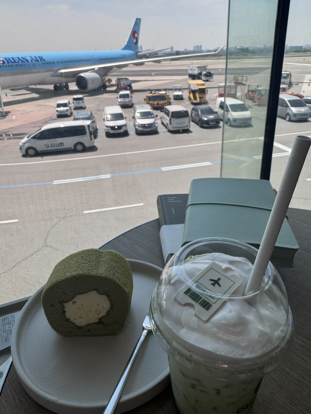 공항에 있는 ‘오설록’에 갔다. 좋아하는 녹차 롤케이크와 녹차라떼를 시킨다. 제주에 갈 거니까 먹는 거도 온통 제주에 관련된 거만 먹고 싶은 이 마음. 먹으면서 다이어리에 다짐을 써본다. 이번 여행동안 아프지 않고 안전하게 힐링하고 오자고.