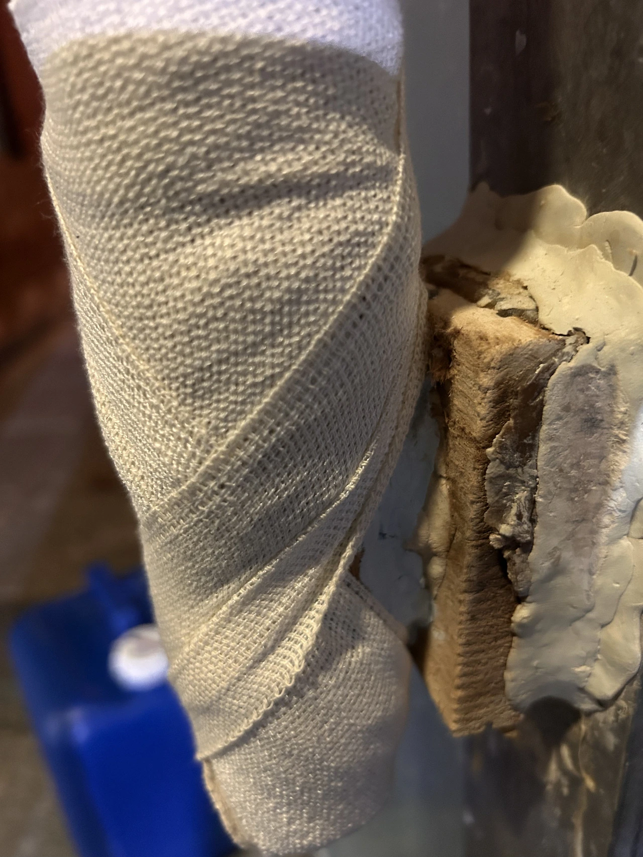 그걸 보는데 이상하게 울컥했다. 간호사 시절 석고 붕대는 '정형외과 사람들'의 영역이었고 나는 그냥 멀리서 구경만 했다. 그런데 지금 내 눈앞에서 그것도 찜질방 문고리에 석고 붕대가 감기고 있었다. 남편은 익숙한 손놀림으로 붕대를 감고 있다.