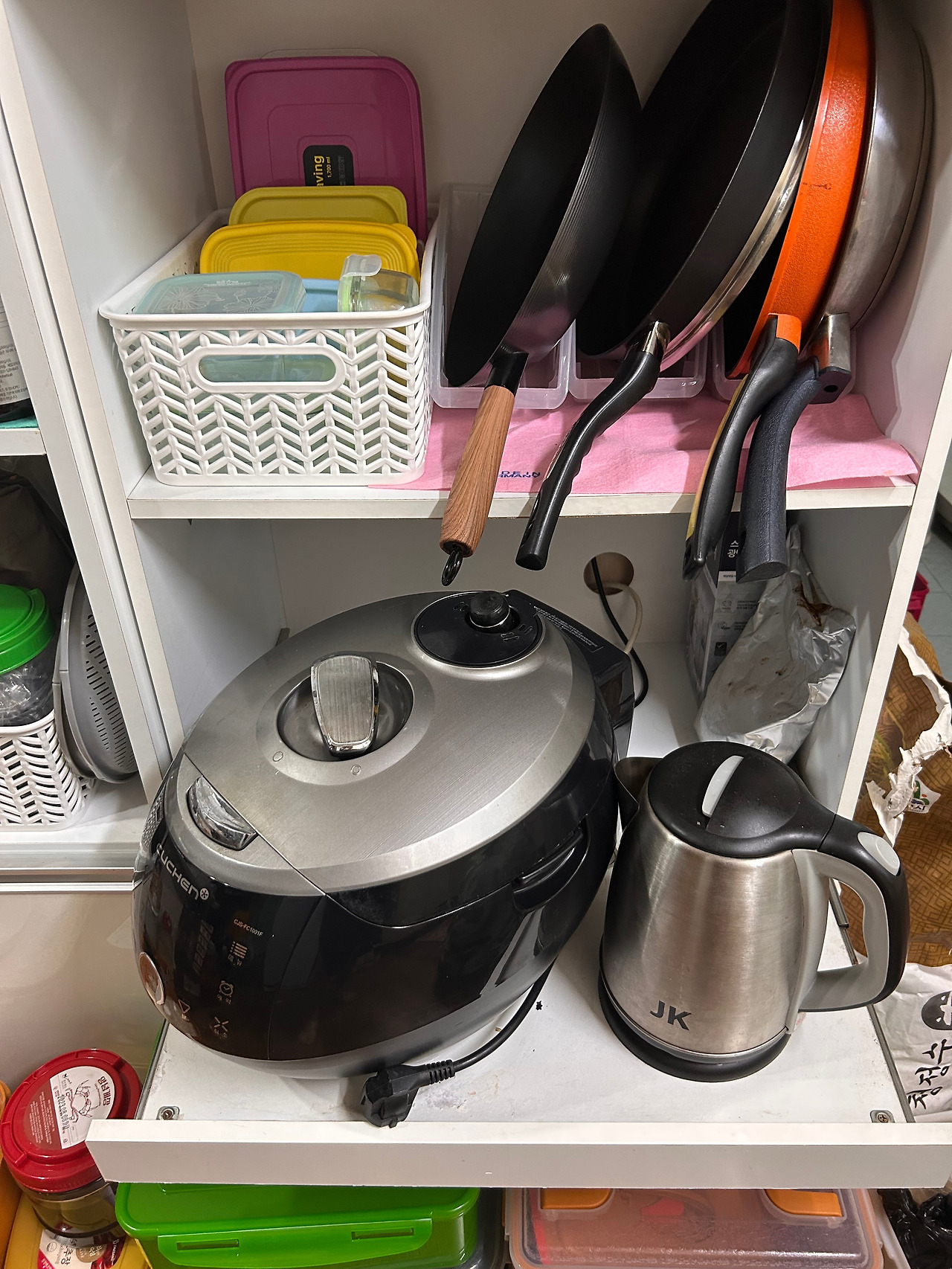 이제 수납장을 정리한다. 수납 바구니를 이용해서 물건들을 정리해 본다. 치우는 과정에 수납에 필요 없는 것이 나온다. 밥솥을 빼고 넣을 수 있는 레일이 필요 없이 달려있었다. 드라이버를 가져와 레일을 빼는데 아빠가 말씀하신다.