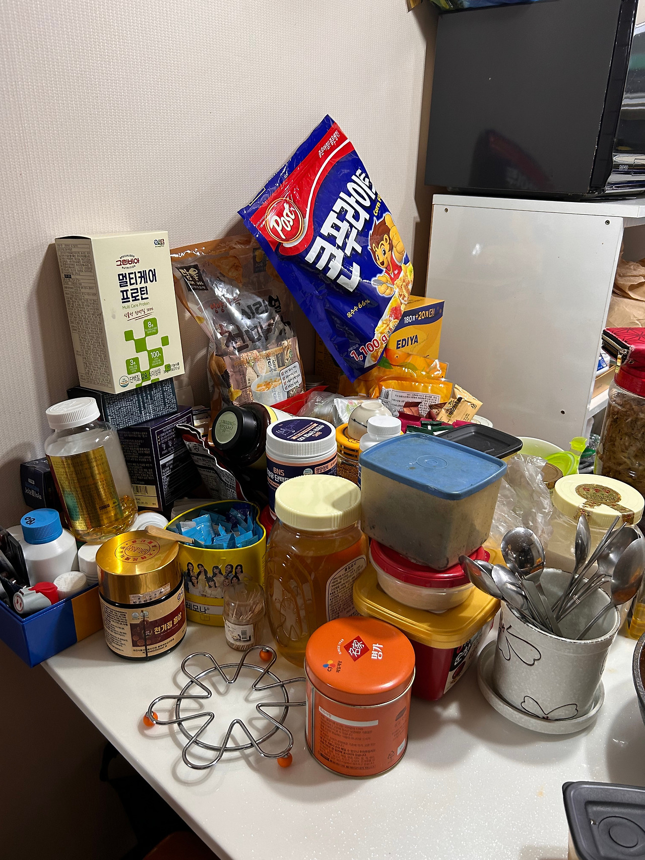 식탁 위에 가득 들어선 물건들. 대부분이 약통들인데 종류를 셀 수가 없다. 그 외 콘프로스트, 국수, 김 등 식탁에 굳이 있진 않아도 되는 것들도 있었다. 수납할 공간도 부족한데 이것저것 물건들만 쌓이니 점점 식탁을 좁게 쓰고 계셨다. 눈에 안 보이면 잊어버릴까 죄다 밖에 빼놓으니 식탁의 반이상 약봉지와 먹을 거로 쌓여있다. 물건들이 반이상 가득 차 1/4 정도만 식탁으로 쓰고 있는 상황. 답답함이 몰려왔다. 식탁 옆에 수납공간도 정리가 안된 건 마찬가지였다. 어떤 쓰임이 있는 것들 인지 알 수 없는 물건들로 제각각이었다. 이렇게 수많은 물건들이 방치되다시피 쌓여 있으니 정신이 없었다.