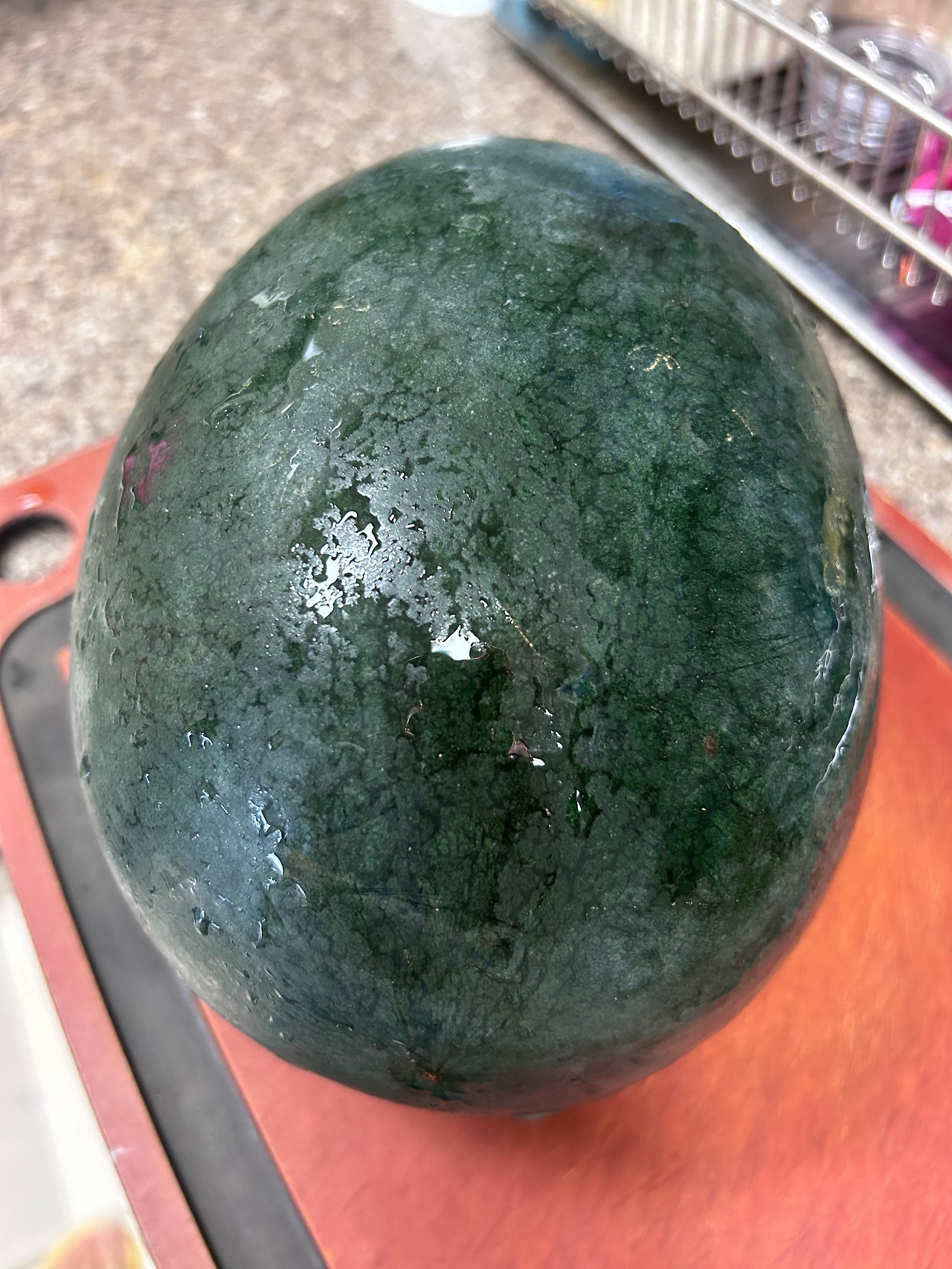 수박이 자라는 모습을 본 적이 있다. 어떤 분이 화분에 볼풀공보다 작은 귀여운 수박을 보여 준 적이 있다. 색깔도 모양도 작은데 앙증맞게 달려 있는 모습이 영락없이 수박의 형태를 띠고 있다. 이렇게 작은 수박이 자라나서 커다란 수박이 되는구나 생각했다. 그 작은 수박을 생각하며 이 멜론 수박도 아버님, 어머님의 정성스러운 돌봄으로 자라났겠구나 생각했다.