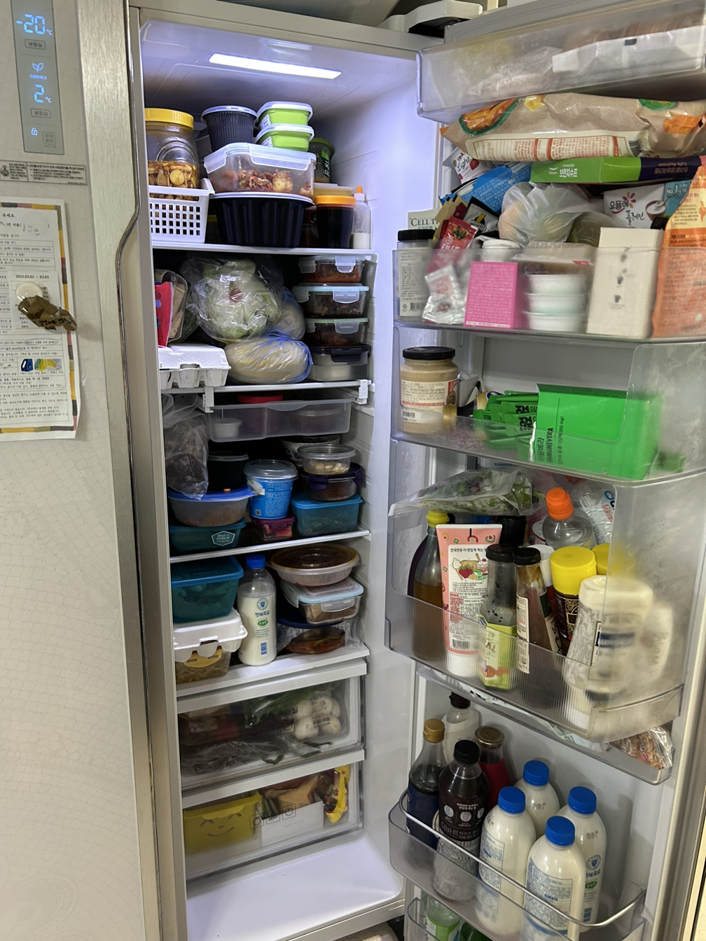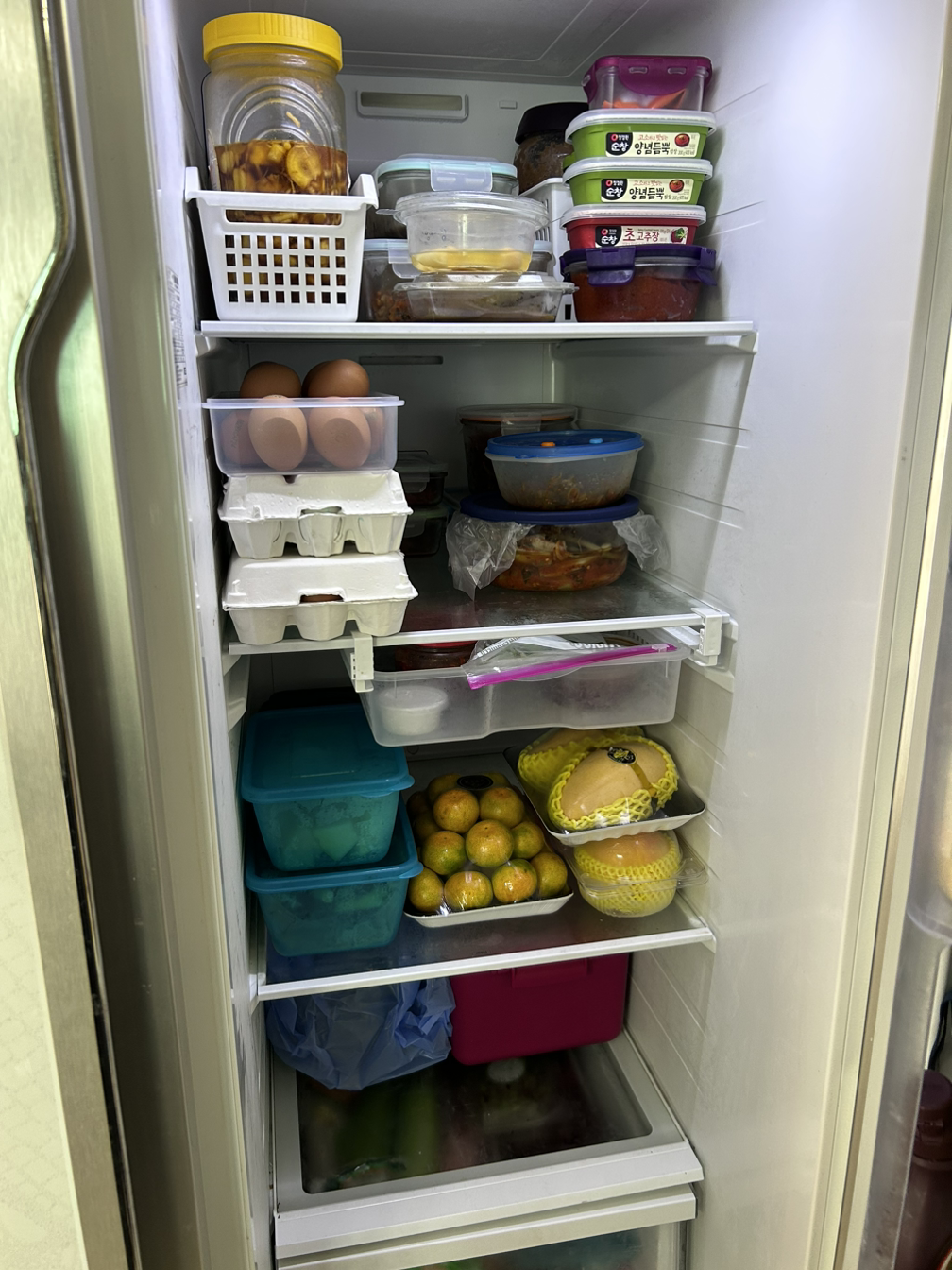 아주 꽉꽉 들어차있다. 마트 가서 사 온 물건들이 테트리스처럼 박혀있다. 문 열자마자 계란이 떨어진 이유도 문칸 빈 공간에 대충 넣어놔서였다. 정리가 시급했다.