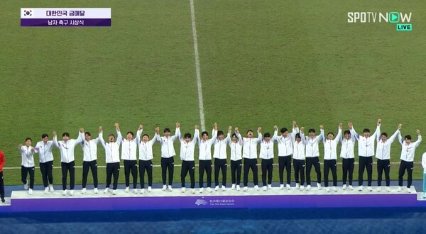 이 아이가 정보를 알려준 덕분에 축구 한일전을 시청할 수 있었다. 우리나라가 통쾌한 승리를 거두었고 금메달 시상식까지 보게 되었다. 그런데 시상대의 위치가 태극기를 바라볼 수 없는 위치였다. 선수들은 모두 가슴에 손을 얹고 애국가를 부르다가, 태극기가 좌측에서 올라가는 모습을 보자, 앞쪽에 서 있던 선수가 몸을 태극기 쪽으로 돌리자 도미노처럼 모든 선수들이 몸을 태극기 쪽으로 돌렸다. 태극기를 등지고 있으면 안 되기 때문이다.