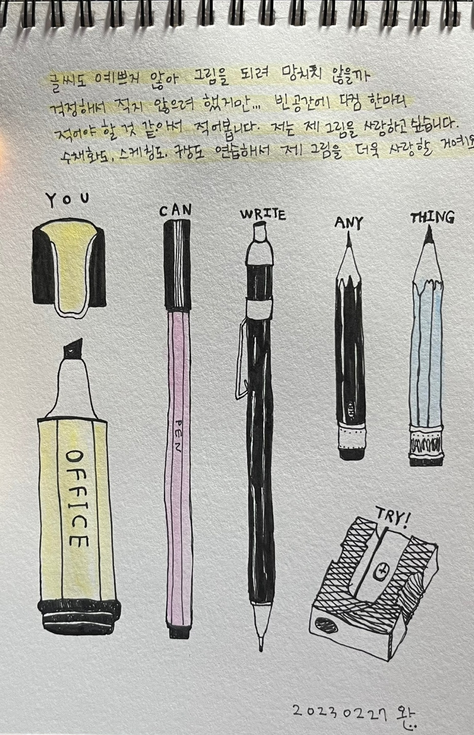 그림 수업이니까 손글씨 쓸 일 없을 줄 알았지! 예상조차 못 했다. 손글씨를 요하는 작업이 많았다. 구상 방법으로 아예 그림일기가 있었으니. 그림은 그런대로 괜찮게 완성했는데 그 위에 웬 갓 입학한 초등학생의 글씨가 턱 하니 자리하고 있다. 다른 사람은 그냥 지나칠 수 있겠지만, 내 눈엔 안 예쁜 게 너무 크게 보였다.
