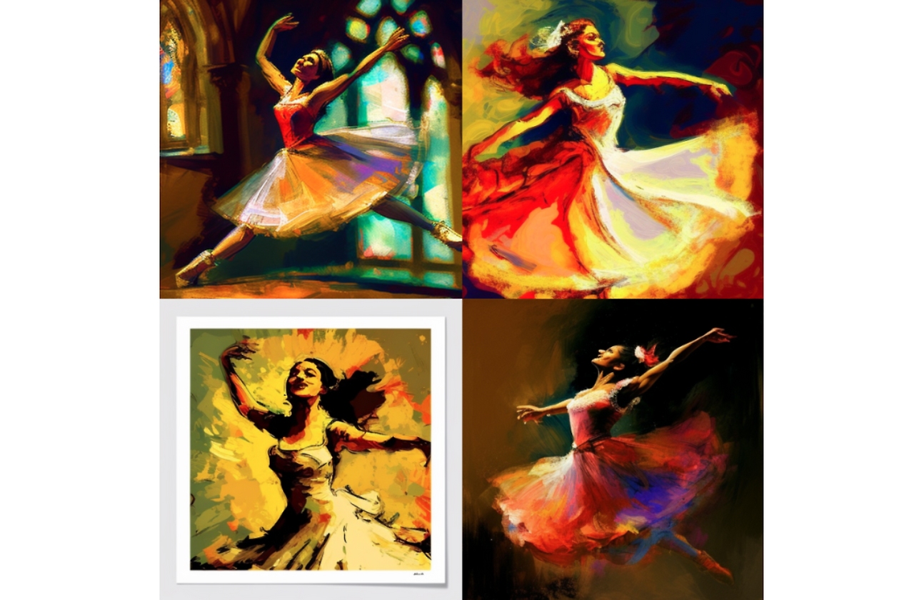 두 번째로 생성한 이미지는 예전에 썼던 <춤과 글쓰기의 공통분모 5가지>에 들어갈 ‘발레리나가 발리우드 댄스를 추는 장면’이었다. 당시 마땅한 이미지를 찾지 못해, 발레리나 이미지를 왼쪽에 넣고 오른쪽에 줌바 댄서 이미지를 넣었다. 미드저니는 과연 어떤 이미지를 만들어낼지 궁금증이 솟구쳤다.