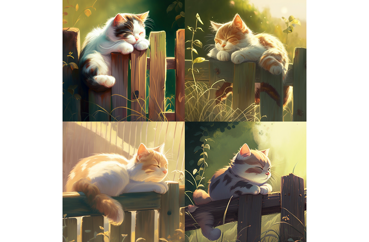 위의 명령어를 입력하면, 네 개의 다른 고양이 이미지가 생성된다. 따스한 햇살 아래 일광욕을 하며 만족스러운 표정으로 졸고 있는 고양이 그림이 나왔다.