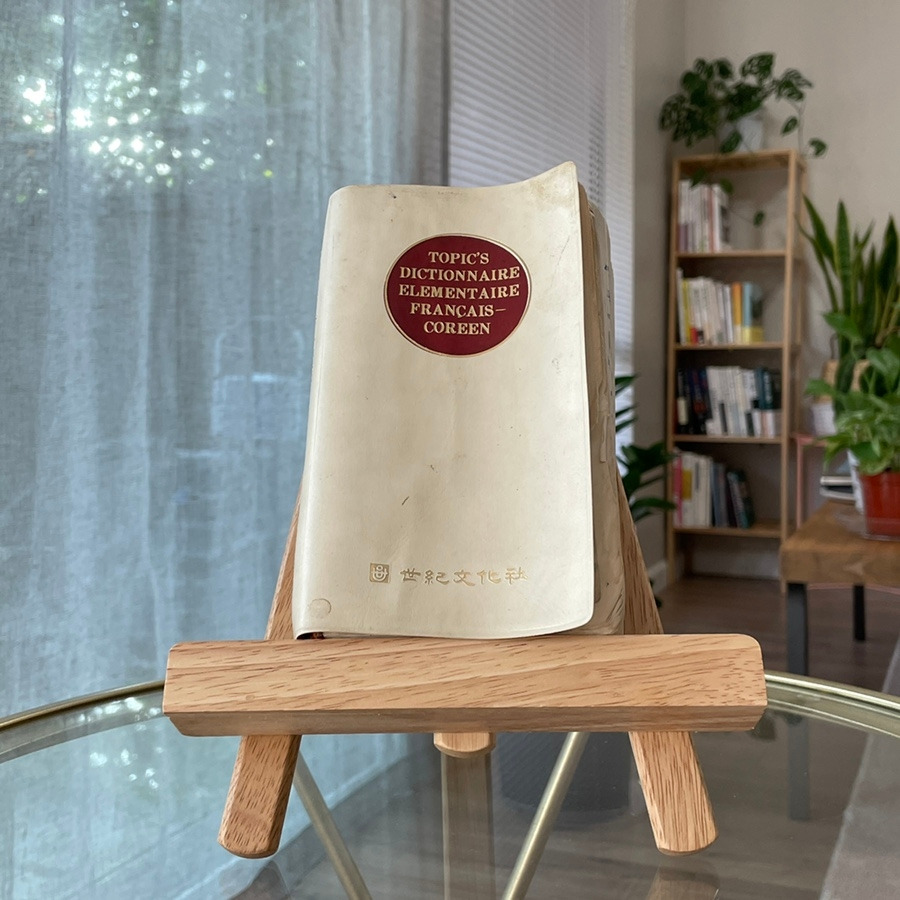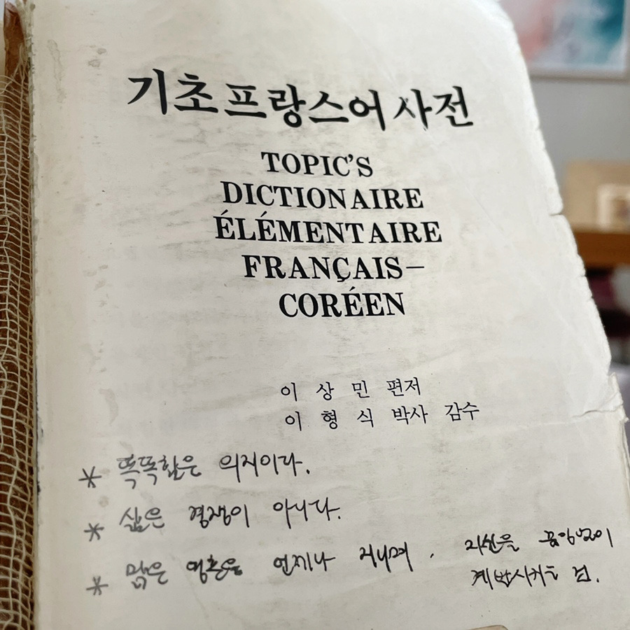 불어공부를 해야 하니 우선 사전부터 꺼냈다. 다행히도 이번 겨울 한국에 갔다가 고등학교 때 즐겨보던 <기초 프랑스어 사전>을 가져왔다. 미국으로 모셔오고 싶은 불어 교재가 정말 많았지만, 현실적으로 짐 초과가 걱정되었다. 당장 쓸 일은 없겠지 내년에 갖고 와야겠군... 하며 넣었던 책들을 다 빼서 박스에 넣었다. 짐을 풀고 불어 사전이 꺼내니, 이거 하나만은 정말 잘 가져왔다는 생각이 들었다. 앞표지와 사전 사이가 너덜너덜해진 이 구석기시대?! 물품은 나의 고등학교 시절 사춘기 시절을 대표하는 물건이다. 표지를 여니 놀랍게도 이런 문구가 쓰여 있었다.