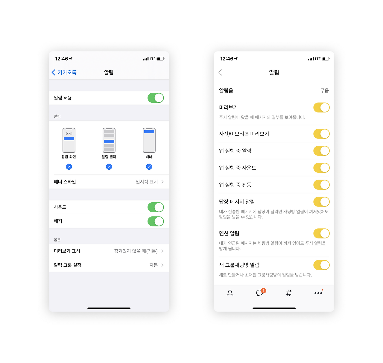 스마트폰 푸시 알림은 사용자가 원하거나 필요한 정보를 제공하기도 하지만, 때때로 앱 사용을 유도하거나 마케팅 정보와 같은 비즈니스 목적의 알림을 포함하고 있기 때문에 원하지 않거나, 필요하지 않은 정보를 제공하기도 한다. 그러므로 사용자가 알림을 켜고 끄거나, 표시 위치를 바꾸는 설정을 제공하고 있으며, 어떤 항목에 대해서 푸시 알림을 보낼지도 세세하게 설정할 수 있다.