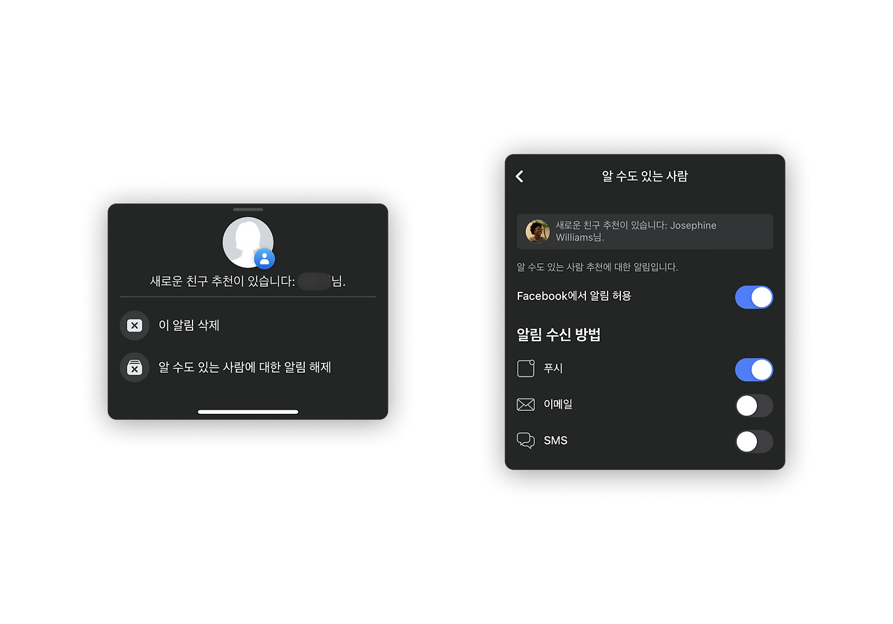 예를 들어 페이스북에서 [알 수도 있는 사람] 푸시 알림을 끄고 싶다고 하자. 어디에서 끄면 좋을까? 두 가지 방법이 떠오른다. 설정 메뉴 어딘가에 있을 알림 설정 메뉴에서 해당 푸시 알림을 끄거나, 최근에 온 [알 수도 있는 사람] 알림 옆의 더보기 아이콘을 눌러서 나오는 메뉴에서 알림을 끌 수 있지 않을까? 페이스북은 두 가지 방법 모두 제공하여 사용자의 다양한 멘탈 모델을 만족시킨다.