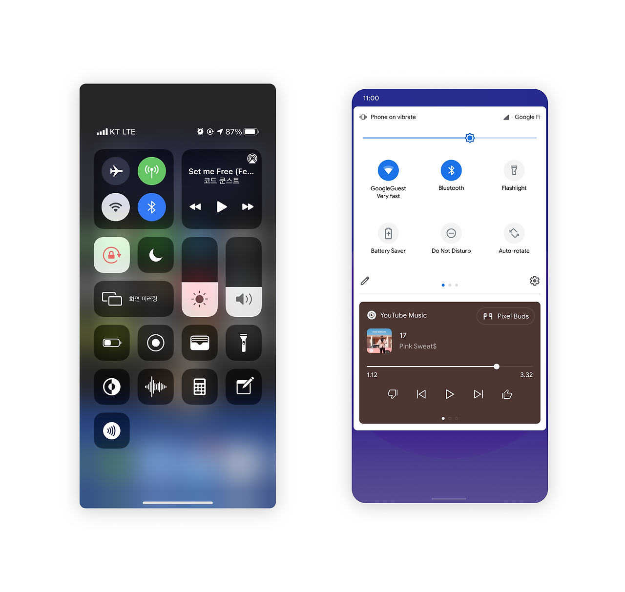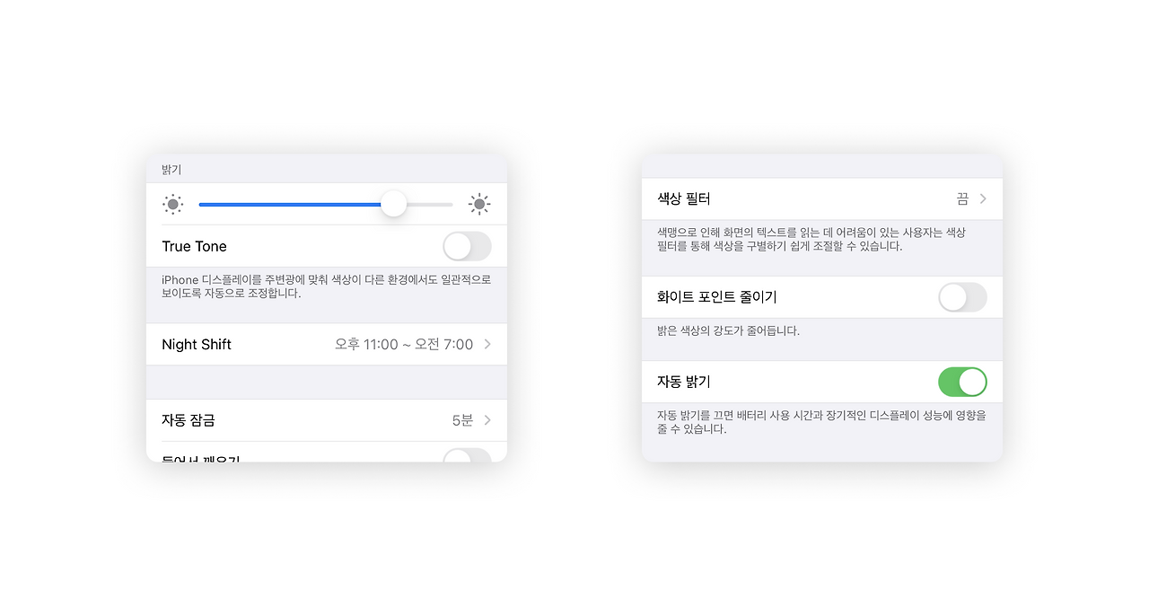 우선 외부 환경 변화에 따라 자동으로 설정 값을 바꿔주는 방법이 있다. 조도 센서를 활용하여 자동으로 화면 밝기를 설정해주거나 시간이나 밝기에 따라 다크 모드로 전환해주는 기능을 예로 들 수 있다. 사용자의 개입은 최소한으로 하면서, 사용자에게 가장 최적화된 기능을 제공할 수 있다는 장점이 있지만, 모든 설정 항목에 사용할 수 없으며, 외부 데이터라는 변수가 추가면서 로직이 복잡해지고, 자연스럽게 동작하지 않을 경우 역으로 사용자 경험을 헤칠 수 있는 단점이 있다.