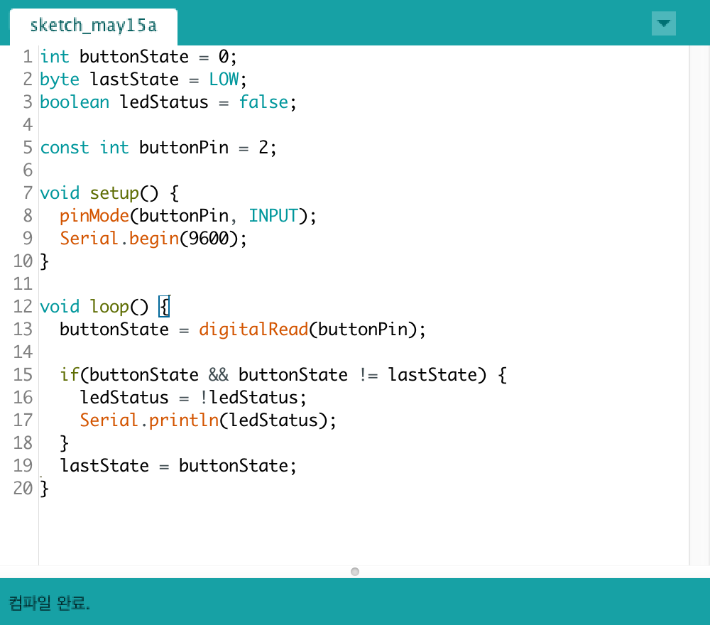 이제 이 두 가지를 합치면 된다. 코드를 복사해서 각 부분에 잘 붙여주면 된다. 여기서는 버튼을 누르면 LED가 켜지고, 다시 버튼을 누르면 LED가 꺼지는 if 조건문만 추가해줬다. 코드도 한 줄씩 설명하면 이해하는데 큰 도움이 되겠지만, 이 글은 프로토타이핑 프로세스에 관한 내용이기 때문에 이번에는 살포시 넘겨본다. 실제 코드와 예시는 여기서 살펴볼 수 있다.