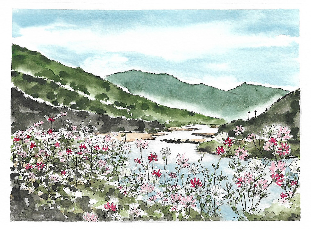 정적을 깨뜨리는 건 늘 바람이다. 임실에서 곡성을 거쳐 구례로 이어지는 강길을 따라 코스모스는 하염없이 피어 있고, 끝도 없이 이어진다. 흔들리는 꽃들이 파도로 들며 날며 하늘을 휘저어도 파랑은 이미 깊다. 그 깊이는 아득히 멀어서 다 자란 코스모스의 키로도 닿지 못한다. 연분홍에 붉은 자주 그리고 하얀 꽃의 무리는 술에 취한 듯 휘청거려도 서로의 빛깔로 번져 들지 못한다. 화려했던 봄날의 기억을 지워가는 벚나무들이 일찌감치 파장을 준비하는 그 아래에서 코스모스는 한참이다.
