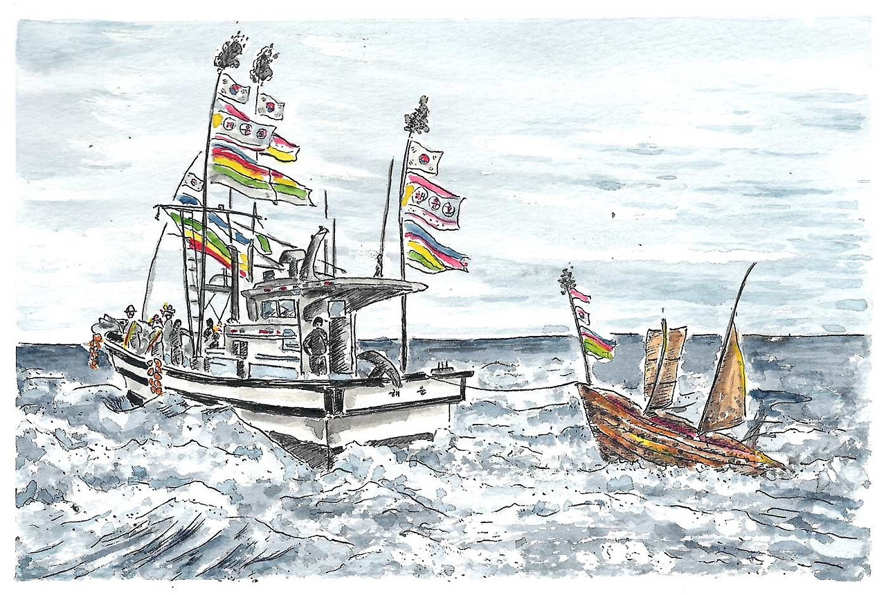 아직까지 풍어제를 이어오는 섬도 있다. 고군산에서 뱃길로 불과 한 시간 남짓 떨어진 부안 앞바다 위도다. 위도 대리마을에서는 지금도 매년 정월 초사흣날이 되면 ‘원당제’를 지낸다. 제당의 이름이 원당이어서 원당제라고 부르지만, 널리 알려진 ‘위도 띠뱃놀이’라는 명칭처럼 잔치에 가깝다. 1985년 중요 무형문화재로도 지정됐다. 마을 사람들은 산 정상에 있는 원당에 올라 당굿으로 제사를 시작한다. 이때 배를 가진 선주들은 한 해 동안 자기 배에 모실 서낭 내림을 받는다. 무녀가 서낭의 이름을 대고 생쌀을 집어 그 수가 짝수이면 서낭이 내린다. 서낭이 내리면 그 이름을 한지에 적어주는데 ‘깃손받기’라고 한다. 어선 하나하나 뱃기마다 깃손을 내려주며 축원과 풍어를 기원한다. 당굿을 마치면 농악대를 앞세우고 뱃기를 든 선주들의 행렬이 마을 한 바퀴 도는 ‘주산(主山) 돌기’를 하며 용왕 바위에서 용왕밥을 바다에 던지고 마을 우물 같은 곳에 들러 제삿밥을 묻거나 간단한 음식을 차린다. 주민들은 술도 한 잔씩 나누면서 묵은 감정을 털기도 하고 덕담을 주고받는다.