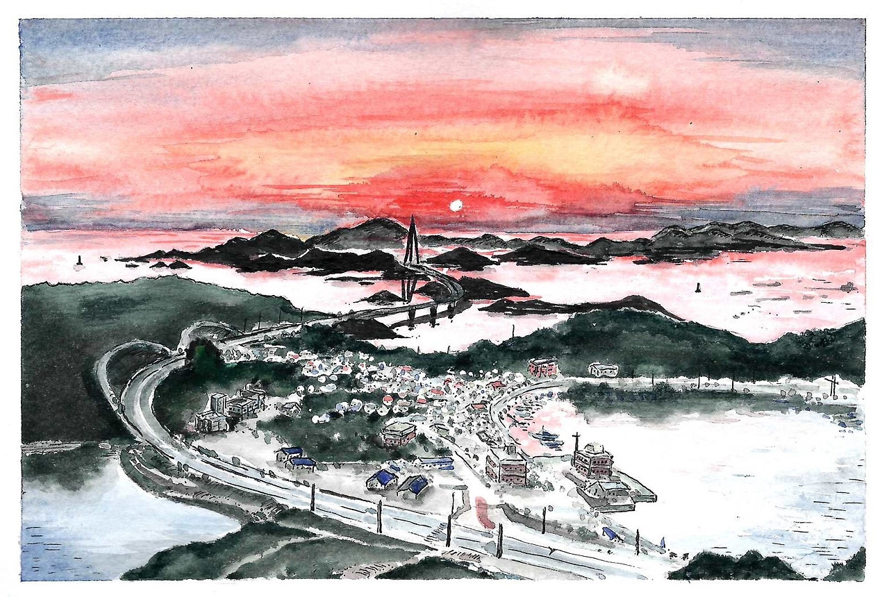 대각산 전망대까지는 가파른 오르막인데, 반듯하게 다져놓은 길 대신 삐죽빼죽 솟아난 바위를 타며 올라야 한다. 잠시 전 골랐던 숨이 다시 벅차오른다. 오르락내리락 길은 가을 하늘까지 이어진 구불길은 드문드문 최치원의 설화가 남겨진 흔적을 더듬어 가는 길이기도 하다. 맑은 날 대각산 정상 전망대에서는 수평선 너머 중국까지 보인다고 한다. 중국 땅에서 우는 닭 울음소리를 들었다거나, 최치원의 글 읽던 소리가 이국까지 닿았다는 말도 전한다. 주섬주섬 이야기 하나씩 주워 담으며 남쪽 능선을 타고 내리면 길은 신시도 마을로 이어진다. 마을 입구 갈림길에서 방조제 쪽으로 뻗어나간 길을 타면 간척한 논둑을 지나 199봉을 끼고 신시 광장 쪽으로 돌아나갈 수 있다. 아니면 월영재로 곧장 이어진 지름길을 타면 저물어가는 해를 등지고 처음으로 되돌아온다.