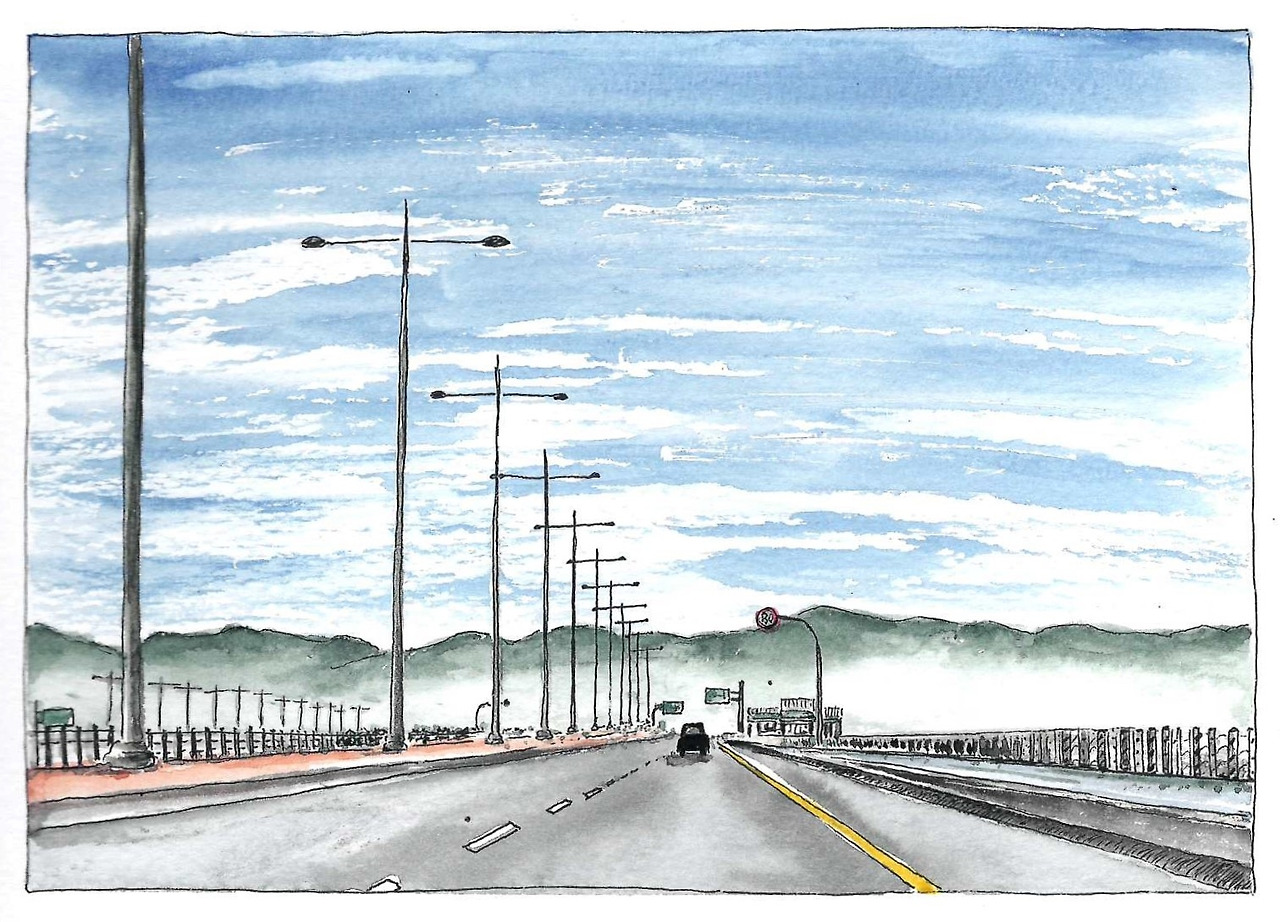 ‘제한 속도 80’은 최저 속도로 이해된다. 흐름을 방해하지 않고, 민폐를 끼치지 않으려면 밟아야 한다. 달려야 한다. 경사도 굴곡도 없는 평면에 놓인 이 길에서는 감정 따위도 없다. 뒤를 돌아볼 틈조차 엄두 내지 못한다. 그저 밋밋하다. 방조제 길이로 세계 최장이라는 기네스 기록은 근대 토목 기술이 자랑처럼 내세우던 지표였다.