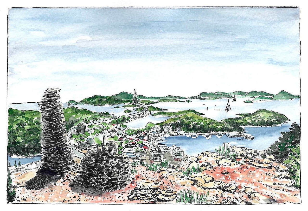 월영봉 정상에서 몽돌해변까지는 내리막이다. 산자락을 타고 내려가는 길에서 시선은 방조제를 오른편에 두고 야미도를 찍고 비응항까지 거침이 없다. 겨우 2백 미터 내외의 봉우리라지만 숫자만으로 상상할 수 없는 풍경은 바다 위에 뜬 섬이 내어줄 수 있는 매력이다.