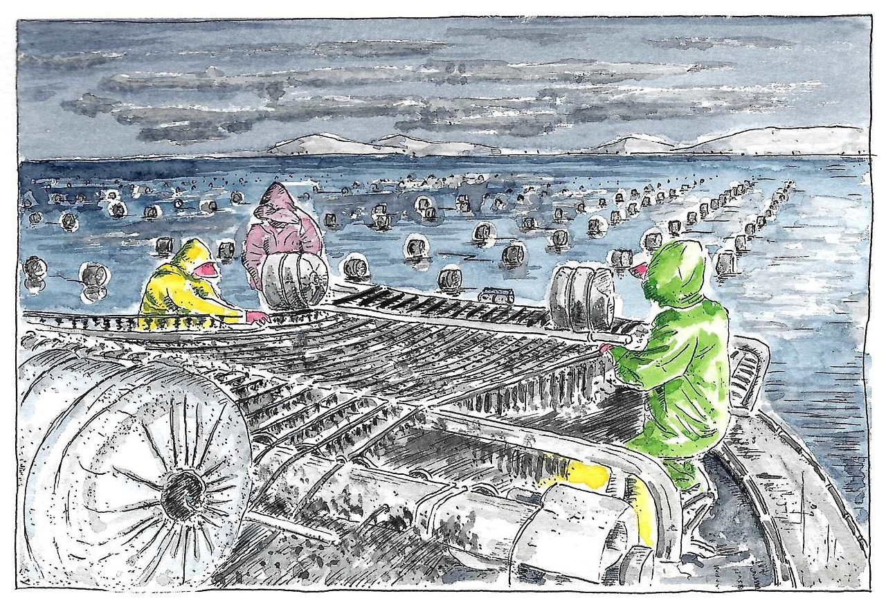 오늘은 도형씨네 김을 터는 날이다. 농사로 치면 마무리 수확을 하는 셈이다. 분양받은 포자를 김발에 붙여 바다에 설치한 것이 지난해 가을이었다. 아무리 바다가 길러낸다고는 하지만 물고기 잡는 것과 달리 기르는 어업은 양식장 관리에 손이 많이 간다. 갯벌에 말뚝을 박아 지주목을 세우는 방식과 달리 김발을 물에 띄우는 부유식 김양식은 손이 많이 가지만 수확량이 월등하다. 더구나 물이 깊은 바다에서도 양식할 수 있다. 섬들이 모여 있는 고군산군도 안쪽 바다는 바람과 파도의 피해가 적고 조류 소통이 좋은 데다가 내륙으로부터 흘러나오는 영양염류가 풍부해서 오래전부터 김 양식이 이뤄졌다. 도형씨네 양식장이 있는 장자도와 관리도 사이도 그렇지만 선유도에서 비안도와 신시도 안쪽 바다는 발 디딜 틈이 없을 정도로 양식장이 들어차 있다. 아무리 목돈이 된다지만 김을 수확 철이 한겨울이다 보니 결코 만만찮은 고역이 따르는 일이다. 일주일에 두어 차례 김발뒤집기도 그렇지만 어쩌다 지나던 배에 걸려 줄이 잘려 나가기도 하고 떠다니다 걸린 쓰레기도 그때그때 걷어내야 한다. 한겨울 내내 바다를 벗어나지 못한다.
