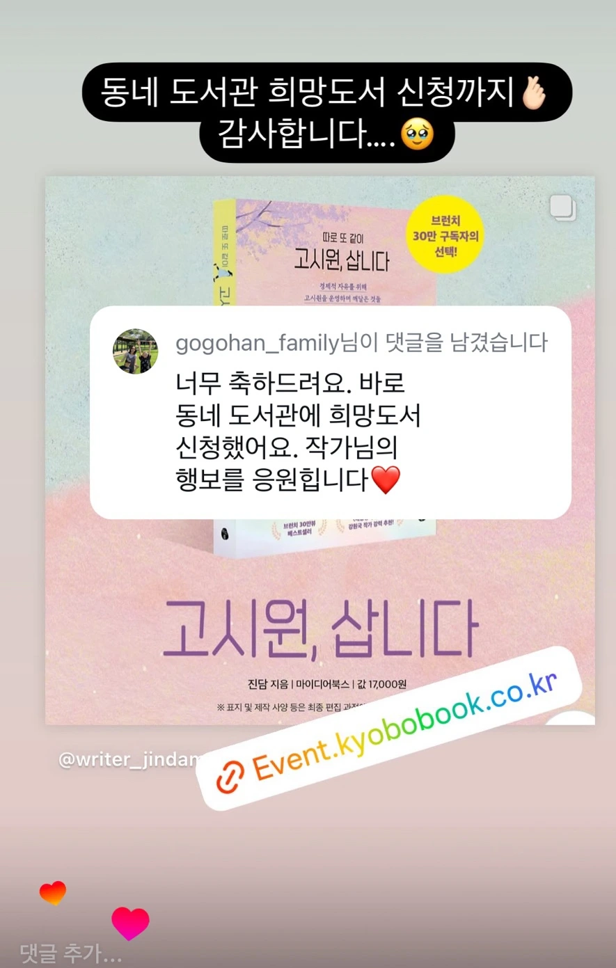유튜브도 없고 블로그, 인스타 다 합쳐도 1만이 안되는 무명의 평범한 워킹맘의 책인 <따로 또 같이 고시원, 삽니다> 에세이가 쟁쟁한 책들 사이에서 고군분투하고 있는 것이 기특하기도 하고 안쓰럽기도 합니다^^;;
