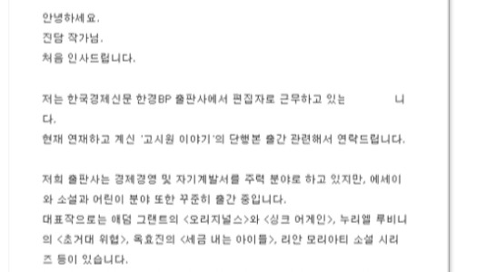 출판사의 댓글이라니. 설마 출간 제안을 하려는 것인가? 그렇다고 하기에는 아직 연재한 글이 몇 개 되지도 않는데. 설마 아니겠지? 반신반의하는 마음으로 이메일을 주고받았다.