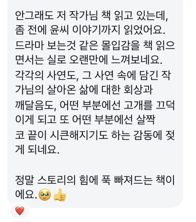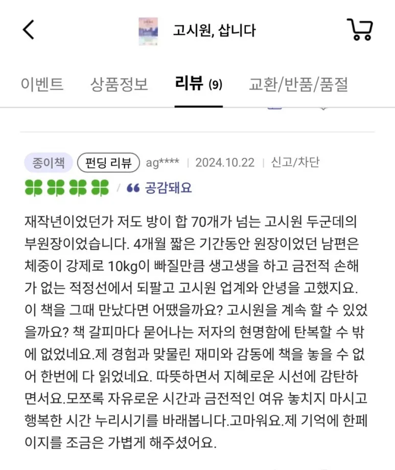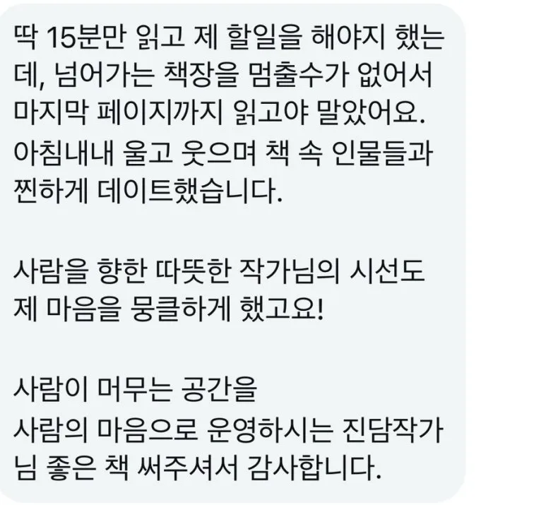 최근 후기 중 가장 기억에 남는 후기입니다. 실제로 고시원을 운영하셨던 원장님이시라고 하는데, 고생을 많이 하셨던 것 같아요. 제 책을 통해 기억의 한 페이지가 가벼워지셨다는 말에 가슴이 찡했어요..부디 즐겁게 생활하셨으면 좋겠습니다^^