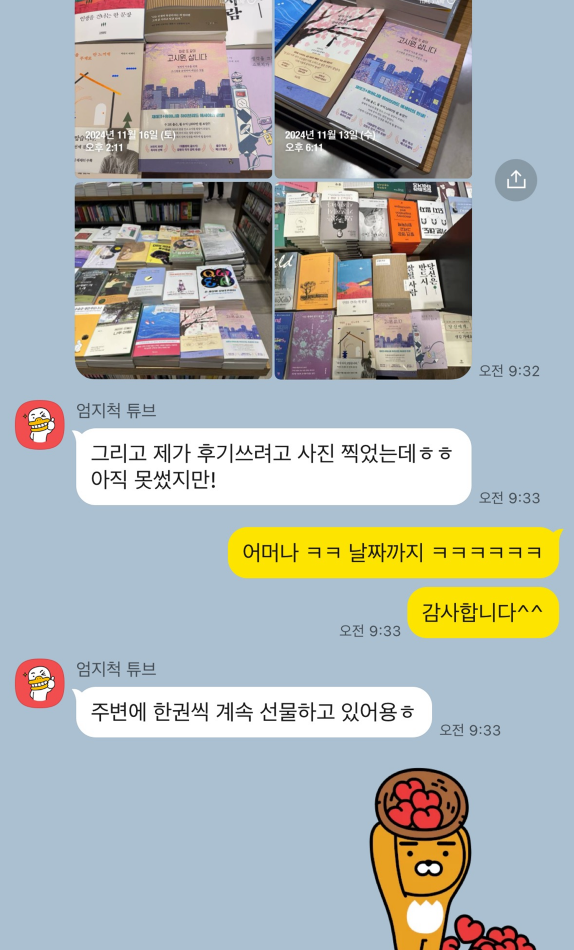 교보 문고 바로 펀딩 첫 런칭에 참여하였고, 첫 작품임에도 불구하고 생각보다 많은 관심을 받아 종합 베스트셀러 에세이 19위까지 올라가는 호사까지 누려보았습니다. 하지만 시간이 흐르며 매일같이 검색하던 순위를 확인하지 않은지는 꽤 되었습니다. 그러나 여전히 꾸준한 후기들이 올라오고 있고, 아직까지는 서점 평대에서 제 책을 만날 수 있다는 독자님들의 제보사진들을 받을 때면 참으로 감사합니다.
