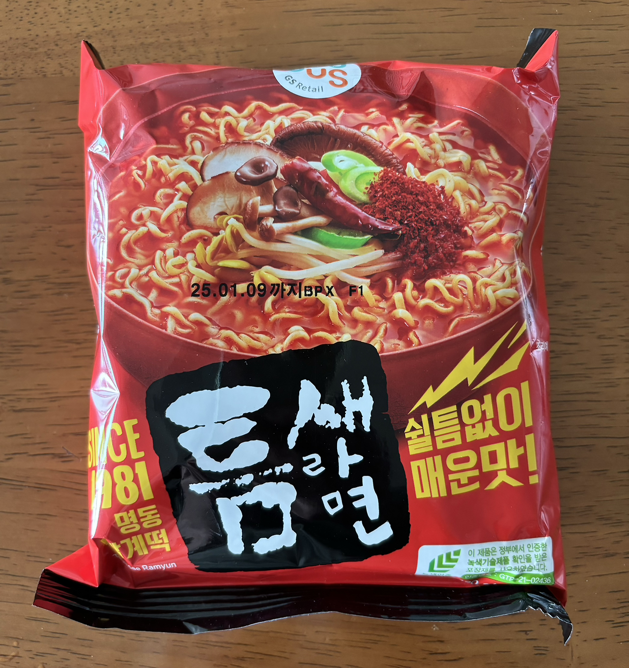 *글을 적는 중 알게되었는데 틈새라면은 팔도 틈새라면과 편의점 유어스 틈새라면으로 구분된다고 한다. 내가 맛 본건 유어스 틈새인데 그래서 그런지 앞전에 먹어 본 팔도 틈새랑 맛의 차이가 있는게 느껴졌다. 늘 먹었던 건 팔도인데 다음번엔 팔도 틈새도 다시 한번 맛 봐야겠다. 이번 계기로 틈새라면 빨계떡이 두 가지 버전이 있다는 걸 처음 알게 되었다.