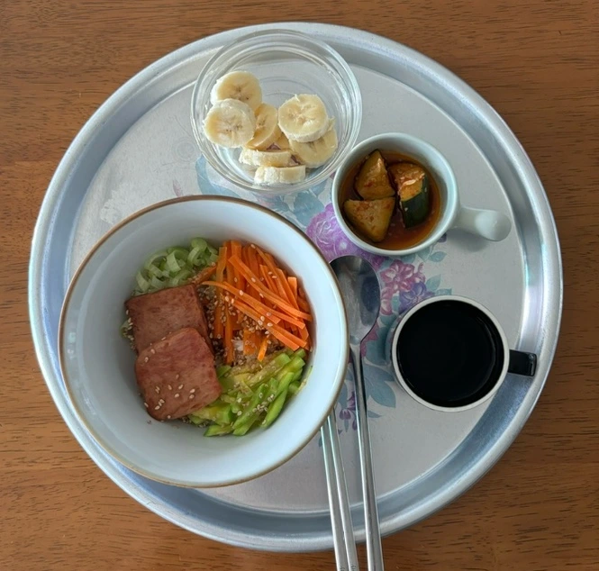 전자레인지 돌린 밥에 노릇하게 구워둔 스팸 세장을 예쁘게 둘러준다. 스팸에 적당한 기름기가 있으므로 참기름은 생략한다. 통깨 조금 뿌려주고.