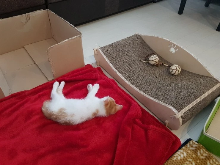 어느덧 꼬꼬마에서 많이 컸다. 요샌 컸다고 집사를 자꾸 깨물 깨물 달려들어 물기도 한다. 자꾸 물어서 고민이지만... 얼른 놀이도구로 시선을 전환하여 놀아준다.