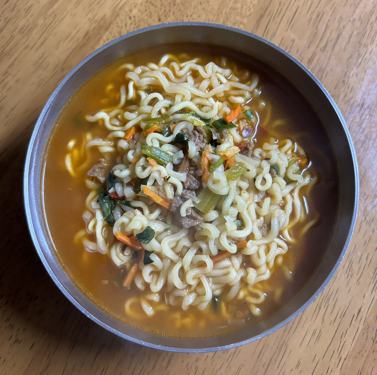 국물 먼저 먹어보니 라면의 정석이랄까 친근한 맛이 느껴진다. 면발은 부드러움과 쫄깃함의 그 중간 어디쯤. 면발에 친근한 국물맛이 배여 들어 정겨운 맛을 내준다. 국물 다시 한번 떠먹어본다. 매콤함이 살짝 따라오는데 그게 그리 맵지는 않다. 예전에는 느끼지 못했는데 약간 신라면과도 흡사하단 생각이 든다. 건더기엔 표고버섯, 파, 당근, 브로콜리 잎, 소고기 후레이크가 보인다. 신라면과 다른 점은 당근이 들어서인가 달큰함이 따라온다는 것. 물론 맵기도 신라면이 더 매콤하긴 하다. 또 다른 건 국물의 걸쭉함이다. 다른 라면에 비해 국물질감이 좀 걸쭉하다. 이 라면을 정의한다면 뭔가 친숙한 편안한 그런 기분이 들게 하는 라면이라고 하겠다. 많은 분들의 사랑을 받고 있는 라면인데 아마도 그래서이지 않을까..