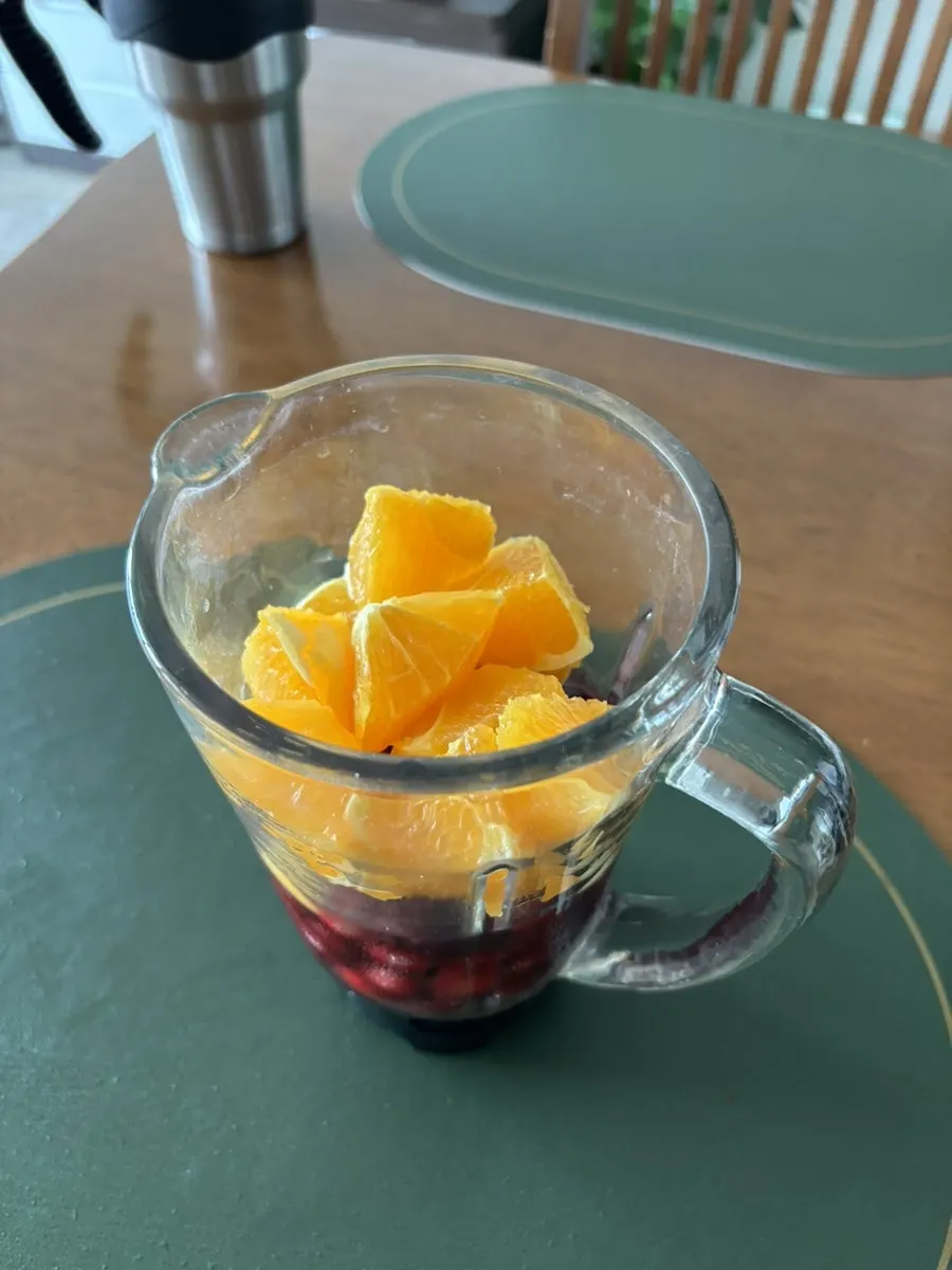 오늘 아침에는 크랜베리와 오렌지를 넣고 갈아 보았어요. 오렌지 1개, 크랜베리 두 주먹 넣고 2인분으로 해서 갈아 주었습니다.