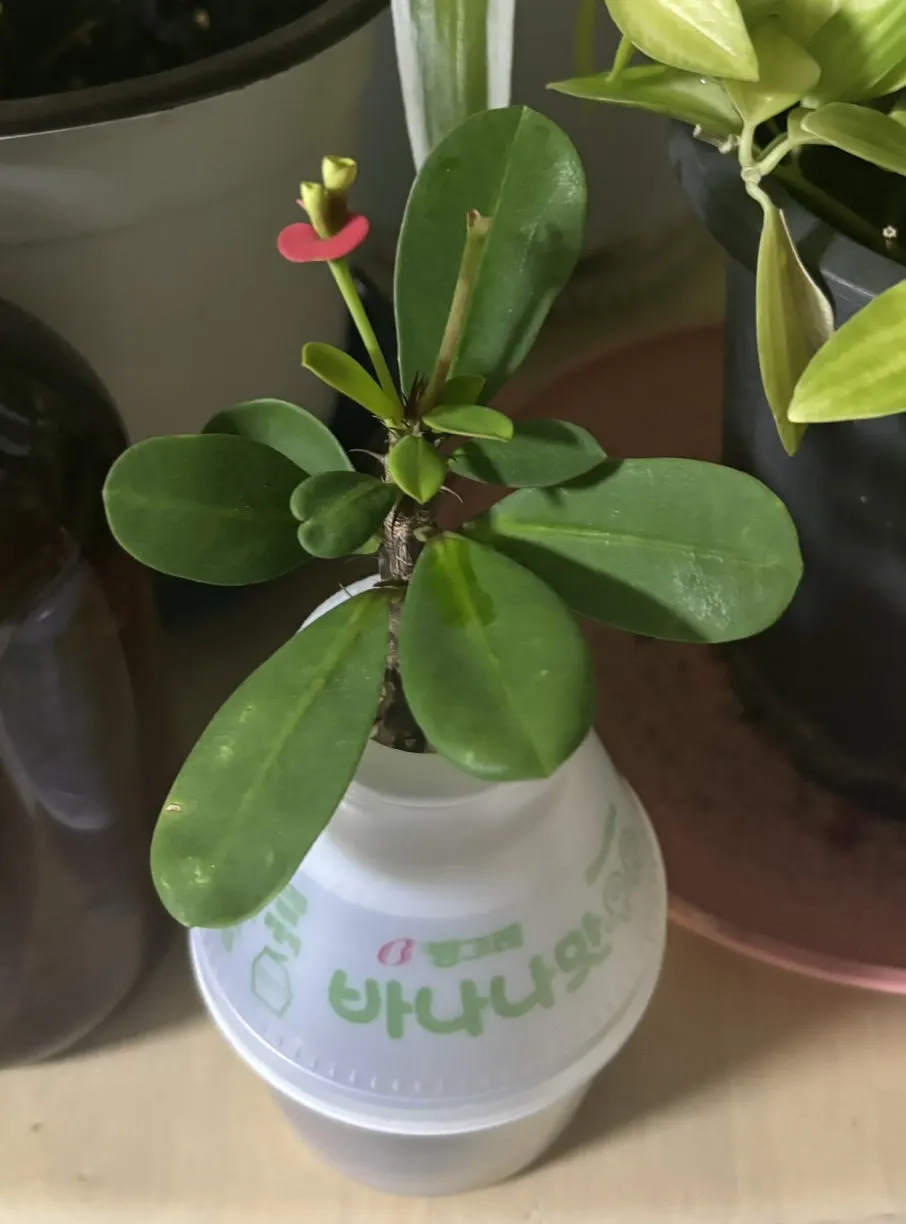 이 가시 많은 화초는 꽃기린이라고 이름하는지 오늘 알았네요. 위로만 쭉쭉 자라 가지치기 하여 물병 만들어 꽂아 두었는데 참 잘 자라고 꽃도 피고 해요. 바나나우유병에 꽂아 두었는데 나름 귀요미이지 않나요?